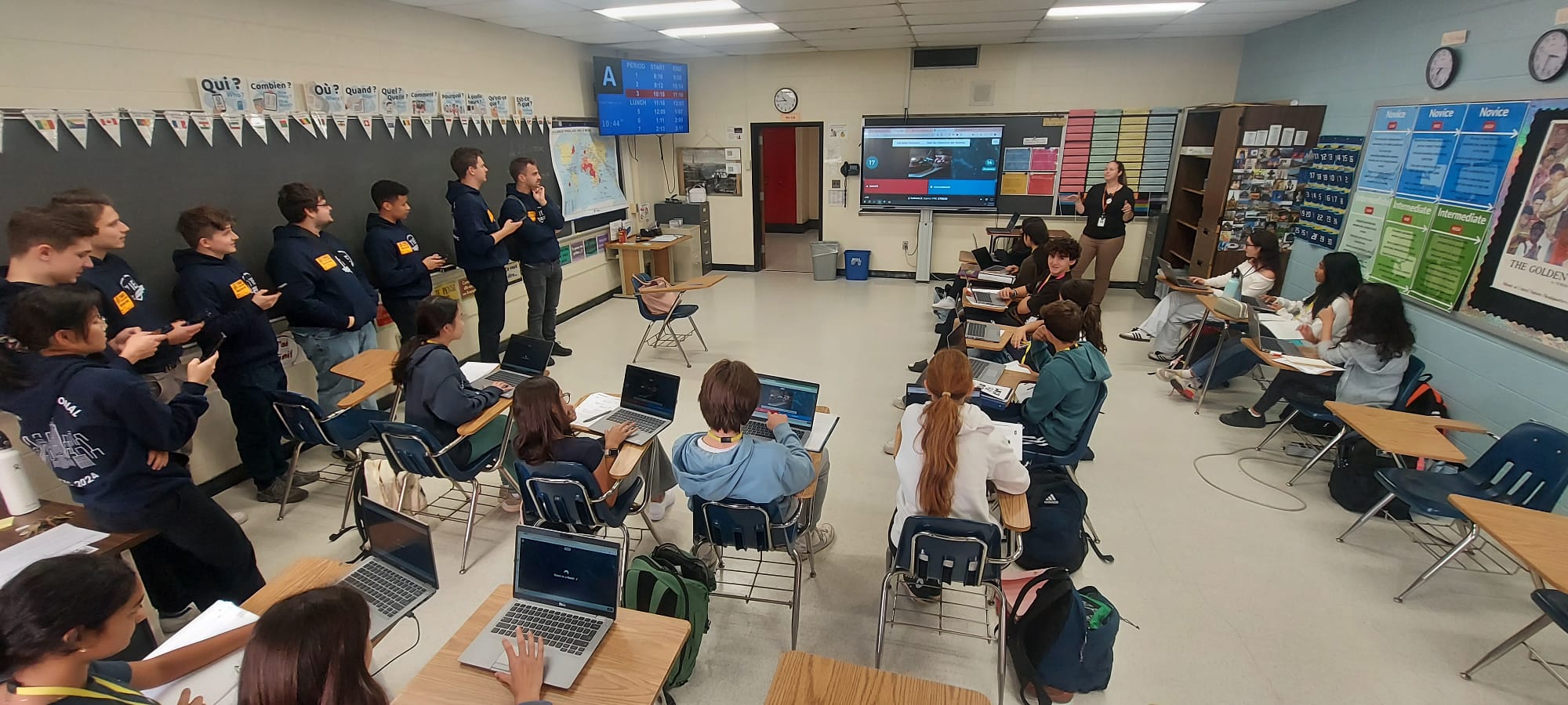 At 8:15, everyone was in the living room, tired but ready for an exciting day at Tenafly High School in New Jersey. We took the metro uptown, then walked across the George Washington Bridge, enjoying the morning view. When we arrived at the high school, we were warmly greeted by the principal, David—better known to the students as Mr. D. He gave us a quick tour of the school, and we visited various classes, including French, where we joined a Kahoot quiz, calculus, and some other subjects.